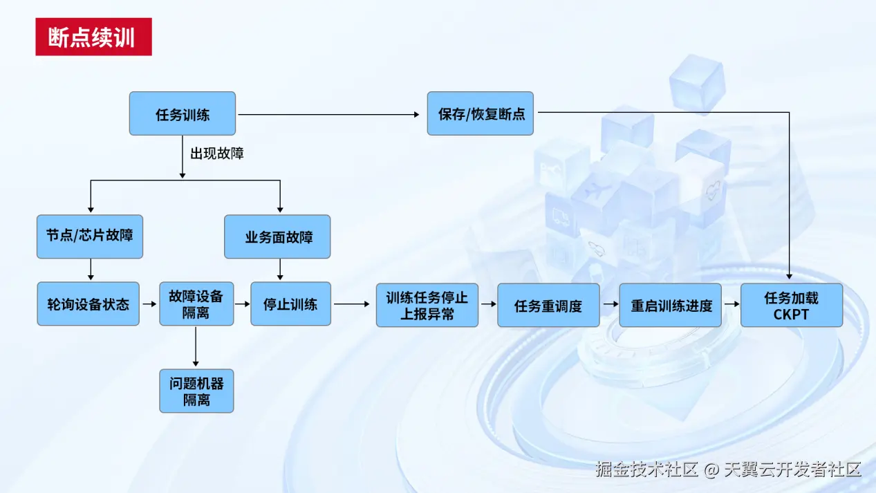 建设丰富的故障库,基于此构建了多维故障感知系统,能够快速主动感知相关故障事件和潜在的故障风险,并通过精准的故障隔离和调度手段,快速隔离处理故障节点并重新调度新节点接手任务继续训练,实现无人干预式断点续训,有效减少GPU闲置时间。