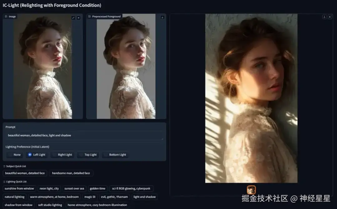 IC-Light 全称为 Imposing Consistent Light,旨在通过机器学习模型实现图像重新照明的项目。它提供了 2 类主要模型:文本条件照明模型和背景条件模型,分别根据文本提示或背景内容对前景图像进行照明调整。