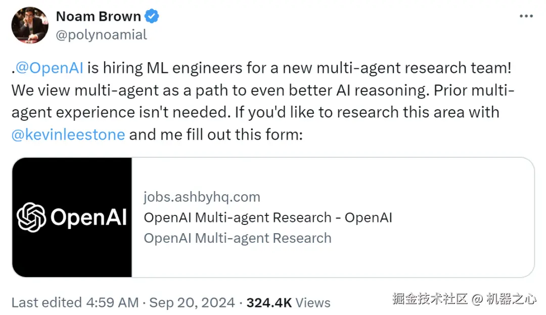 毫无疑问,多智能体肯定是 OpenAI 未来重要的研究方向之一,前些天 OpenAI 著名研究科学家 Noam Brown 还在 X 上为 OpenAI 正在组建的一个新的多智能体研究团队招募机器学习工程师。