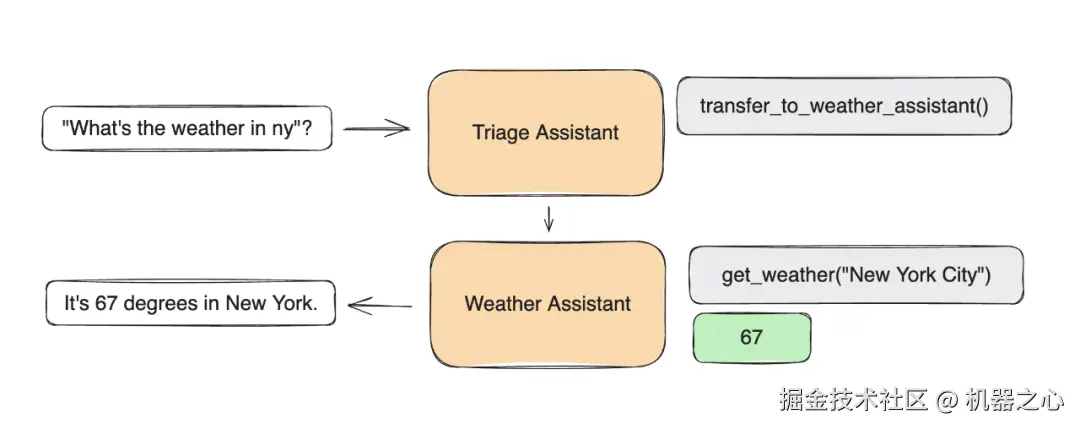 简单的天气查询智能体示例,问题先经过筛选智能体处理,再转交给天气智能体解答
