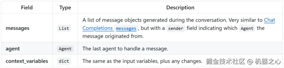 它还可以通过返回更完整的 Result 对象来更新 context_variables。如果你希望用单个函数返回一个值、更新智能体并更新上下文变量(或三者中的任何组合),它还可以包含一个 value 和一个 agent。