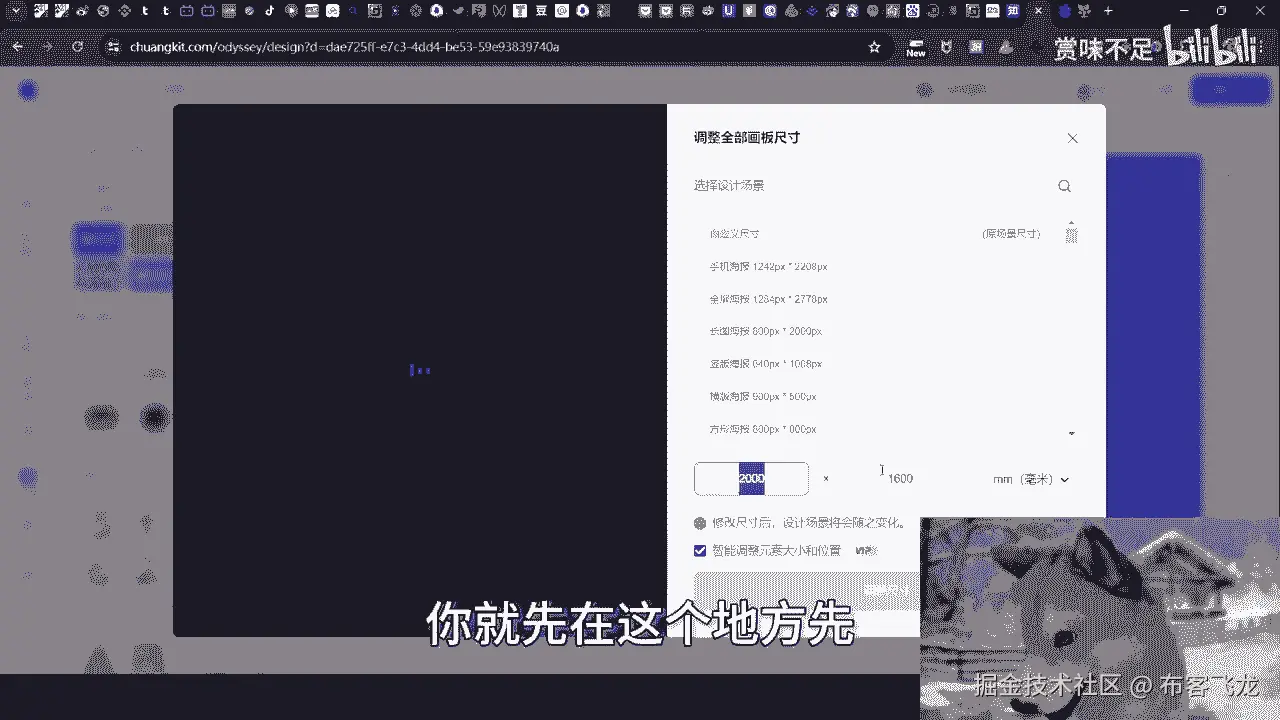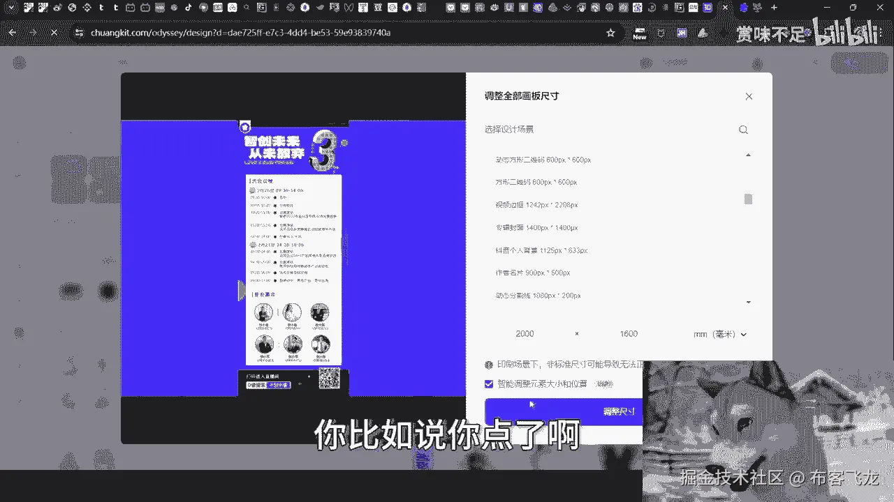 比如说我们点一下调整尺寸,你看到吧,调整尺寸,这个就是2000×1600,对不对好,那么你看啊,里面这个东西他现在不是整个海报没有撑满嘛,对吧好,那么你到底后面怎么去调整,你就把它打。