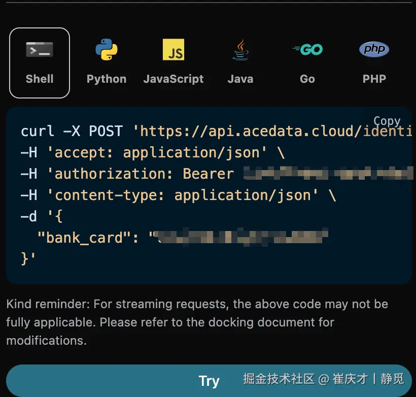 另外如果想生成对应的对接代码,可以直接复制生成,例如 CURL 的代码如下: