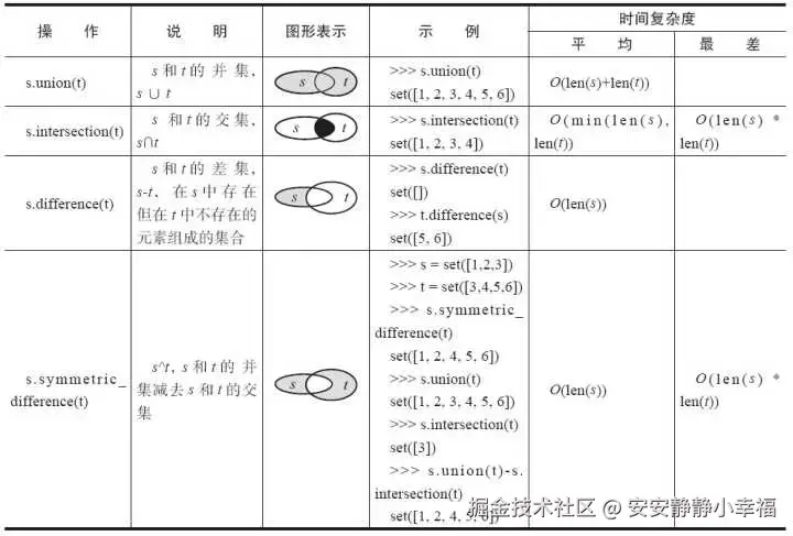 实际上 set 的 union、intersection、difference 等操作要比 list 的迭代要快。因此如果涉及求 list 交集、并集或者差等问题可以转换为 set 来操作。