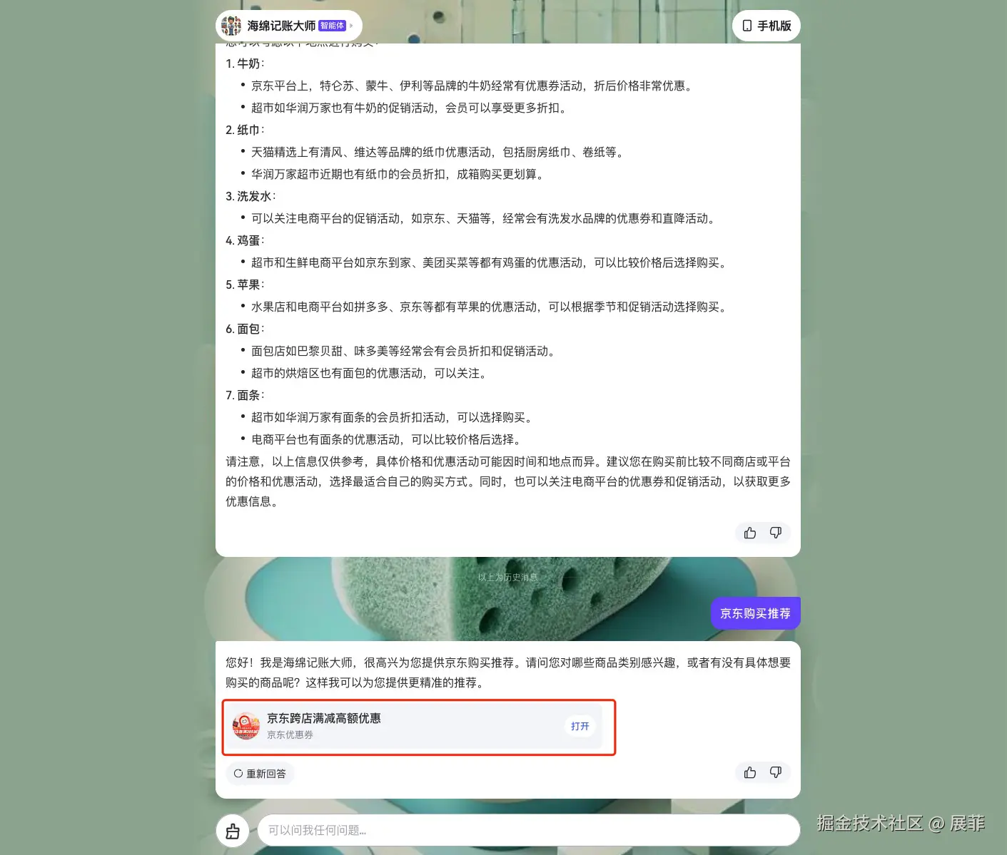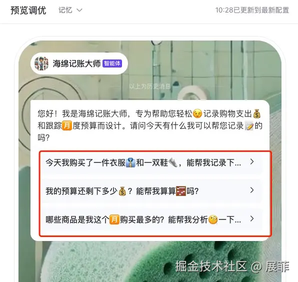 发布后的“海绵记账大师”可以顺畅地与用户进行交互。用户能够快速添加购物支出,智能体会根据用户的消费习惯给出优化建议。