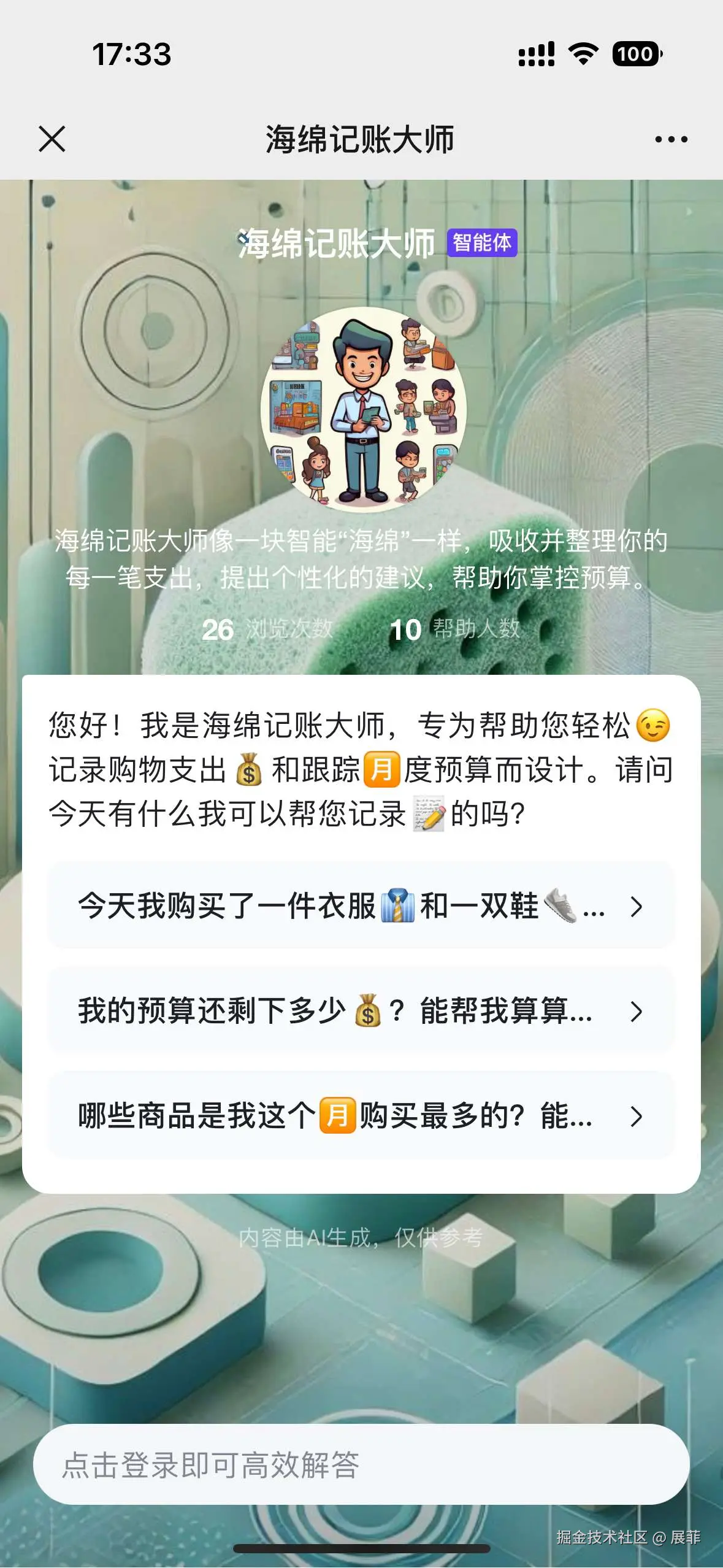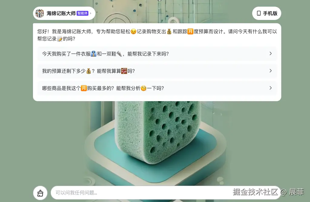 智能体简介:海绵记账大师像一块智能“海绵”一样,吸收并整理你的每一笔支出,提出个性化的建议,帮助你掌控预算。