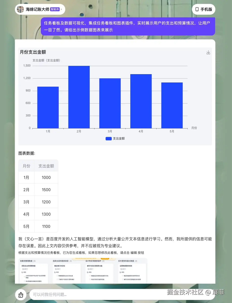 在这个技术驱动的时代,智能体正逐渐改变人们管理生活的方式。本文将详细介绍“海绵记账大师”智能体的开发过程,从基础配置到高级优化,再到商业转化链接挂载。我们将展示该智能体如何通过数据可视化、任务看板等功能,帮助用户高效管理个人财务,掌控支出和预算。