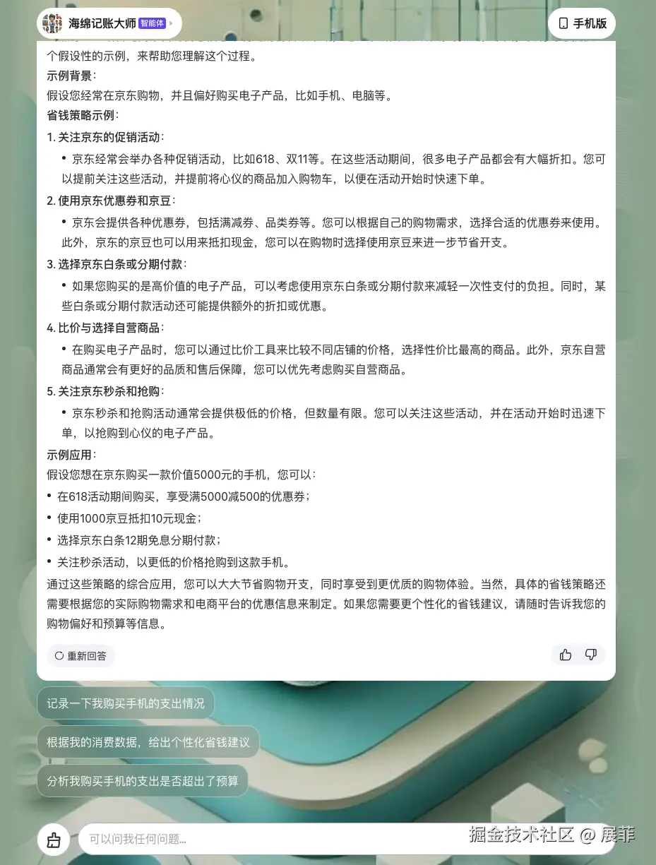 - 个性化预算建议:通过分析您的历史消费,智能体能够给出定制化的预算管理建议。