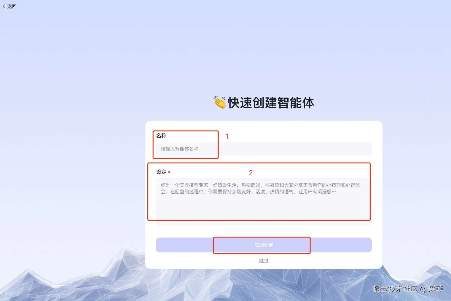 会打开快速创建智能体页面,这个页面只需要输入你想创建的智能体名字,和你希望给智能体设定的功能范围。比如我创建的智能体名字为:“海绵记账大师”,我希望这个智能体能帮助用户管理每日消费和预算。