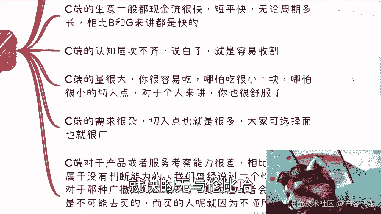 因为你看啊,首先你C端做的再多,量变是产生不了质变的啊,你不可能说你C端做的不错,C端做的很多,然后正起就贴上来说,我来给你单子,我给你钱赚,我靠你不赚,他妈的,我心里不舒服,不可能的,说难听点。