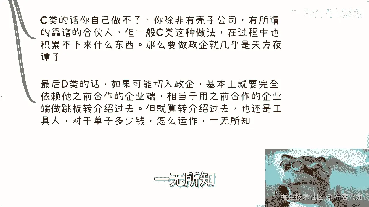 然后做了一些C端的生意啊,或者也做了一些B端生意吧,都可以啊,那么D类的话呢,如果可能去切入政企,基本上就要完全依赖于他之前合作的企业端,也就是说跟这个D类去签,兼职合同的那些企业端。