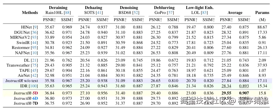 图5. 在五个图像恢复任务(5D)上的定量结果,与通用图像恢复和全能图像恢复方法的最新方法进行对比。我们突出显示没有文本(仅图像)的参考模型,最佳整体结果以及次优结果。同时,我们呈现了我们多任务变体的消融研究(从5到7个任务—5D、6D、7D)