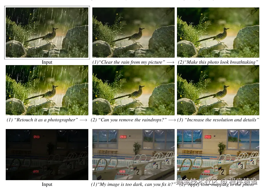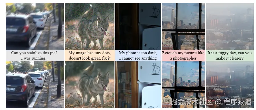 图1. 给定一幅图像和提升图像的指令,我们的全能恢复模型通过人类指导纠正图像。InstructIR 能够处理各种类型和程度的降级,并在一些实际场景中实现泛化