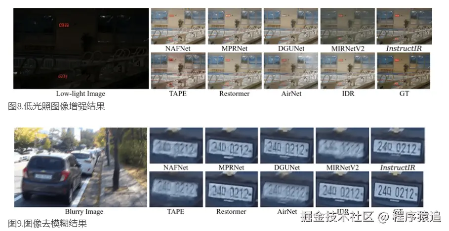 InstructIR 模型在不同降级任务上表现出色,为用户提供了强大的图像处理工具。通过引入人类编写的指令,模型能够成功还原图像中存在的各种降级,包括去雾、去雨、去模糊、低光增强等任务。论文通过详细的实验证明,InstructIR 通过指令引导的方式,能够精准地理解用户的意图,并根据指令进行图像恢复,为用户提供了更为精细和自由的图像处理体验。