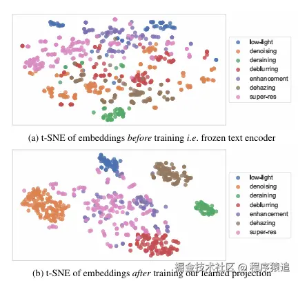 图3. 我们展示了InstructIR训练前后文本嵌入的t-SNE图。每个点代表一个人类指令