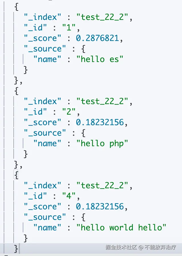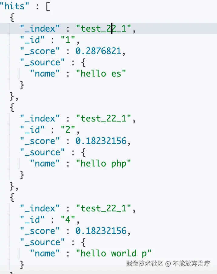 因为文档1 在分片2上,文档2、文档4在分片1上。这就是我上述所说的,得分是基于文档所在分片计算的。这与逆文档词频有关,下文会介绍。