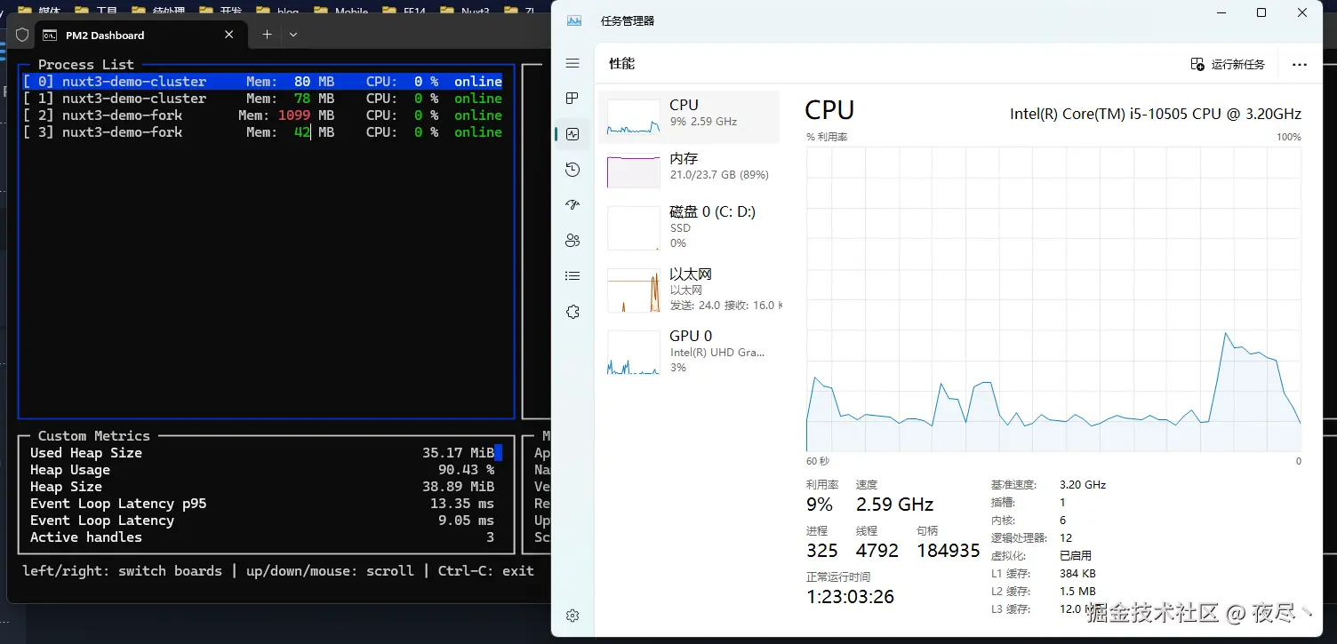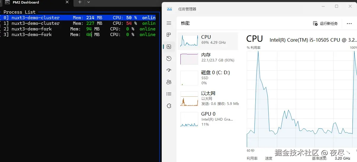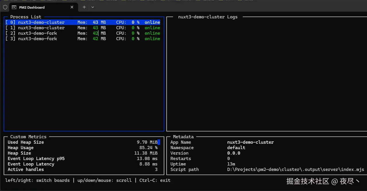 首先我在本地启动了一个 nuxt3 项目,这里模拟服务器环境只用了 2 个实例,然后使用两种不同的 pm2 启动方式执行。