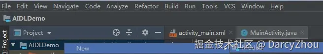 (1)在服务的文件夹app 中,执行步骤:右键 -> New -> AIDL -> AIDL File, 名称为IMyService。
