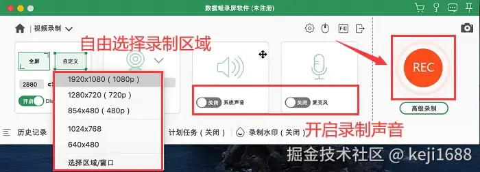 步骤3:我们也可以选择【视频录制】模式进行即时的录制,在录制前可以自由选择录制的区域和开启录制的声音等,然后点击录制按钮【REC】进行电脑录屏。