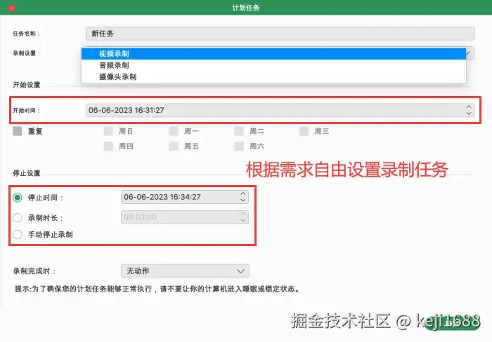 步骤2:为了节省时间同时不错过屏幕上的精彩内容,我们可以点击进入【计划任务】中设置录制的任务,如自动开始录制和自动停止的时间等。