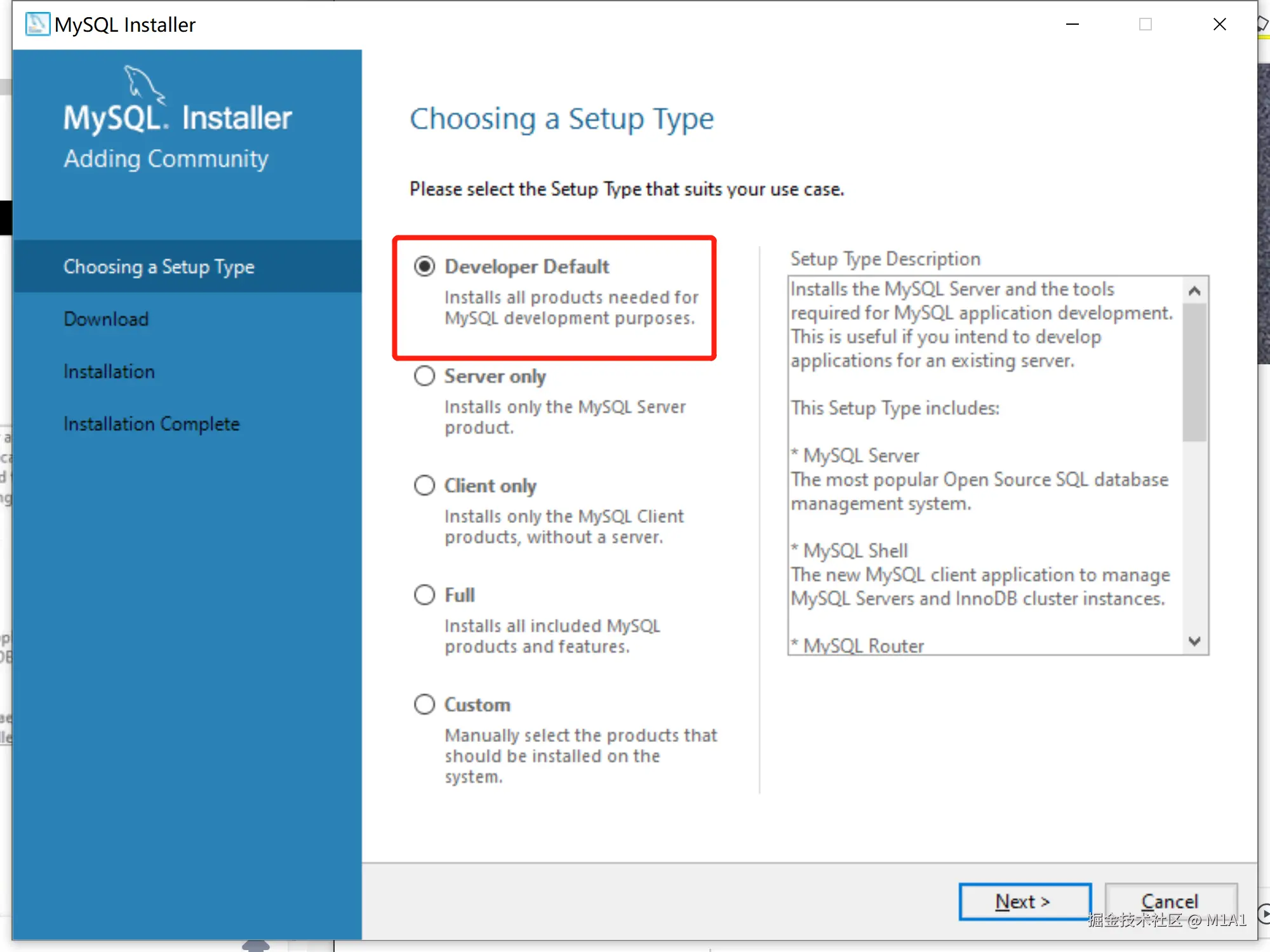 选择需要安装的类型,这里选择开发默认类型,会同步安装客户端、JDBC连接等。如果本地已有客户端,可以选择Server only