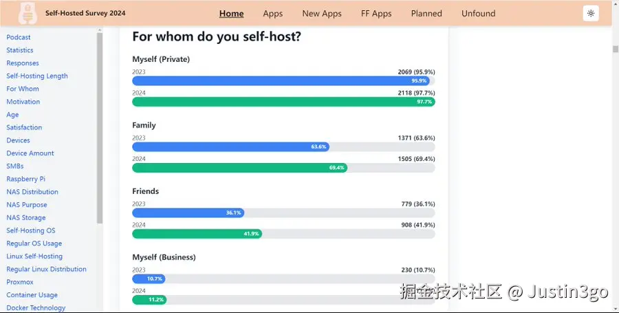 老用户应该知道本周刊已经推荐了很多可以自部署的应用,对于自部署笔者也较为关注,这是一份2024年关于自部署应用的调查报告,简单提几个: