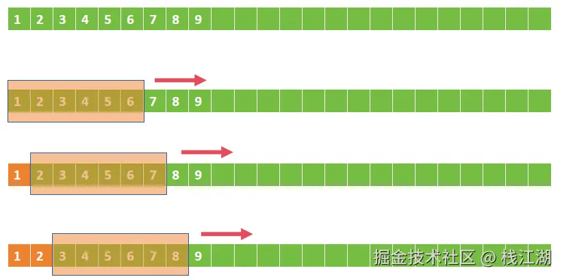 - 初始位置:把窗口放在前面3个数字上,所以你看到的是[1,2,3,4,5,6]。