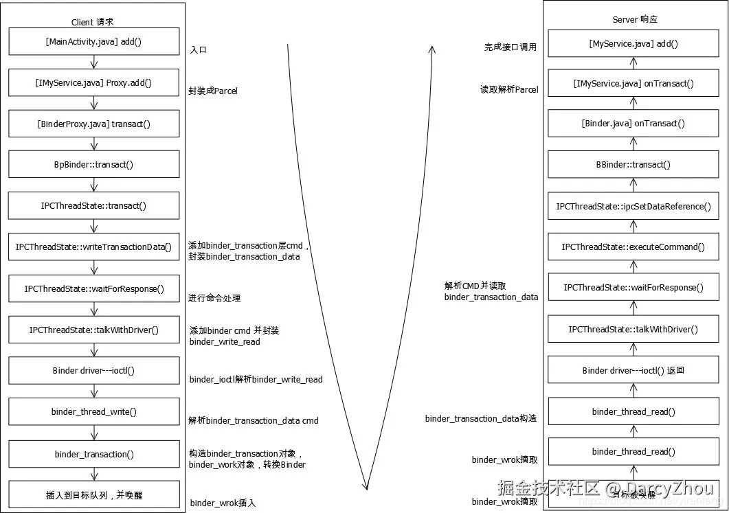 - Client调用AIDL的方法add(),其实调用的是IMyService.java中的Stub.Proxy.add(),最终通过BinderProxy.java的transact()向服务端发送;