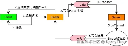 Client通过Proxy向Server进行请求,最终进入Binder Driver,binder根据不同的事务处理,发送给Binder实体,实体中根据不同的TRANSACTION code转入不同的逻辑处理,处理完得到结果后,会把数据组装为Parcel,通过reply发送出来,Client收到reply的数据,进行最终流程处理。