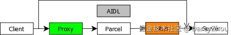Proxy()组装了Client中的AIDL接口的核心实现,组装Parcel数据,调用BinderProxy()的transact()发送TRANSACTION code。