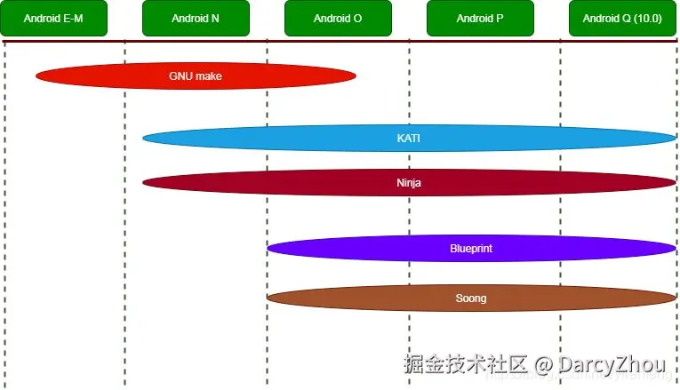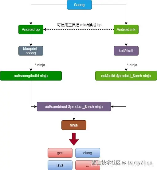 Google在 Android 7.0之后,引入了Soong构建系统,旨在取代make,它 利用 Kati GNU Make 克隆工具和 Ninja 构建系统组件来加速 Android 的构建。