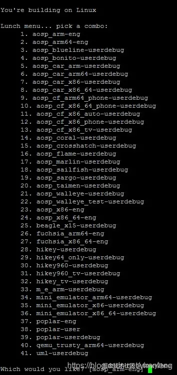 环境变量初始化完成后,我们需要选择一个编译目标。lunch主要作用是根据用户输入或者选择的产品名来设置与具体产品相关的环境变量。如果你不知道想要编译的目标是什么,直接执行一个lunch命令,会列出所有的目标,直接回车,会默认使用aosp_arm-eng这个目标。