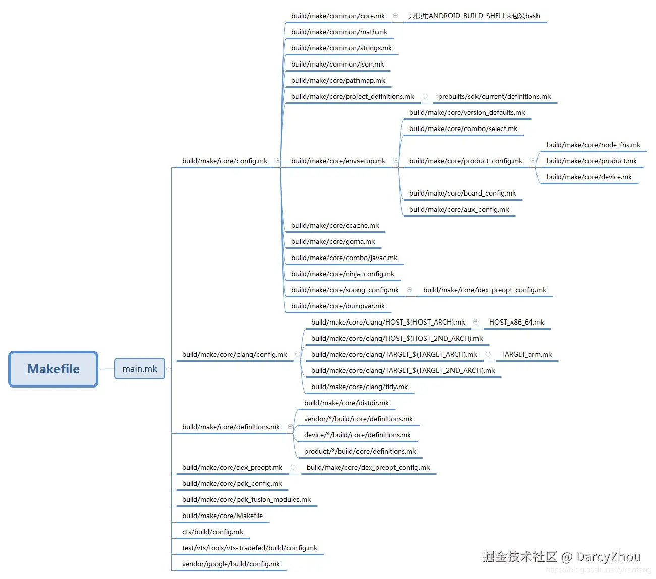 执行runKatiBuild时有个重要的步骤,就是加载build/make/core/main.mk,main.mk文件是Android Build系统的主控文件。从main.mk开始,将通过include命令将其所有需要的.mk文件包含进来,最终在内存中形成一个包括所有编译脚本的集合,这个相当于一个巨大Makefile文件。Makefile文件看上去很庞大,其实主要由三种内容构成:变量定义、函数定义和目标依赖规则,此外mk文件之间的包含也很重要。