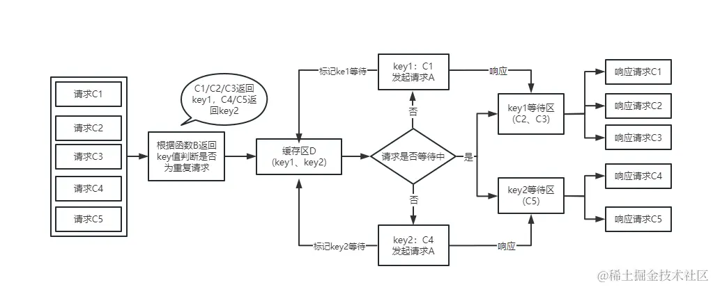 即使在一个方法内也会出现重复请求的问题,比如获取一个数据列表内关联的表单详情逻辑,如果不做任何处理的话大概是循环再发起请求,发起的请求数是N,一般情况下的话可能的做法是:创建一个缓存map用于记录以获取的form,同时阻塞循环: