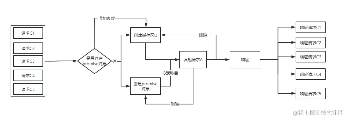 明知道这里的重复请求,我们就不能避免了吗?比如在公共的顶层去缓存数据、或者在组件间共享数据。。。当然可以解决,但这又导致了一个问题:“耦合”,比如vuex缓存数据,还会导致一个问题,数据更新问题。这时候promiseLock的设计就出现了,promiseLock实现很简单,就是预先创建一个闭包用于缓存promise,在promise完成后销毁,promise未结束前的请求全部指向一开始创建的promise,当然会有key参数去区分不同请求;这样就做到了一个请求周期的缓存,在上一个请求为完成前不会创建新的请求。这样就可以很好的解决同一时间点并发的相同请求,并且把请求优化的逻辑和组件间“解耦”了。