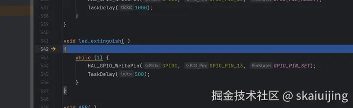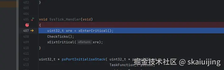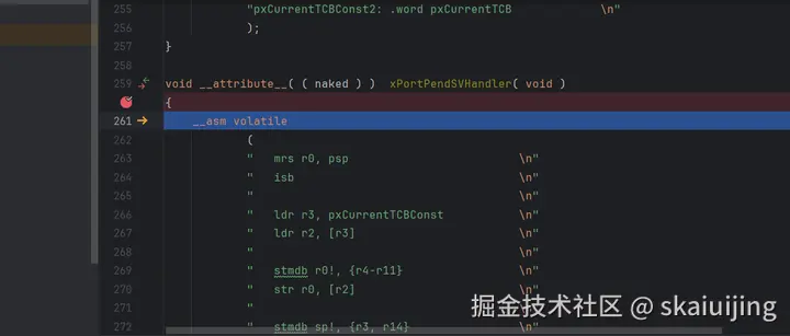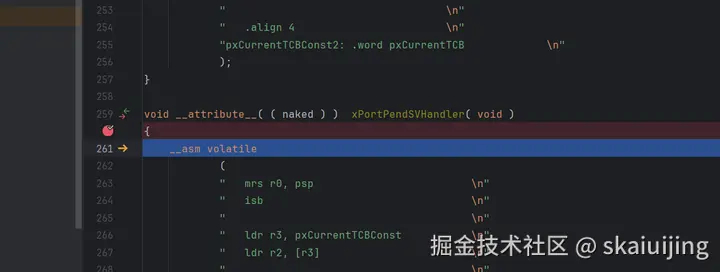 为了观察上下文切换,程序中的中断是首要观察目标,我们在xPortPendSVHandler和SysTick_Handler里面打上断点,继续执行,在执行完TaskDelay后,程序进入了xPortPendSVHandler中断函数内部: