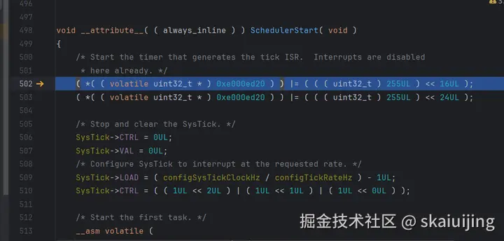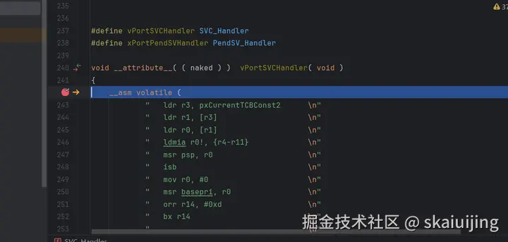 继续执行程序,我们发现我们进入了一个由汇编程序组成的函数中,这是SVC中断,通过注释,我们知道,就是它开启了第一个任务: