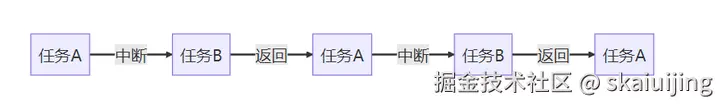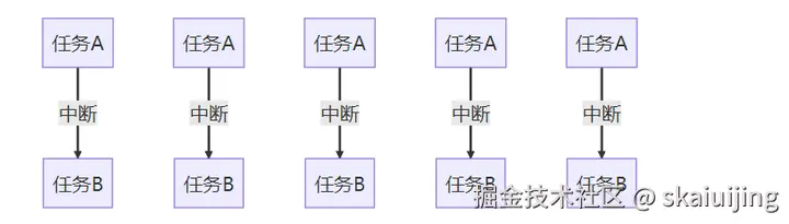 中断是一种异常,在发生中断时,单片机会保存现场,在中断完成后,会及时恢复现场。那么,假设只有两个任务,一个是正常执行的任务,一个是中断中的任务,假设中断不断发生,从微观层面上看,单片机的任务执行过程是这样的: