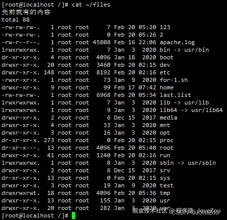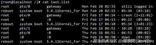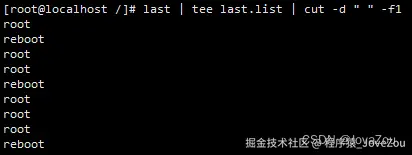将last的结果输出到 last.list 中,并以空格为分隔取last的第1段打印到屏幕上