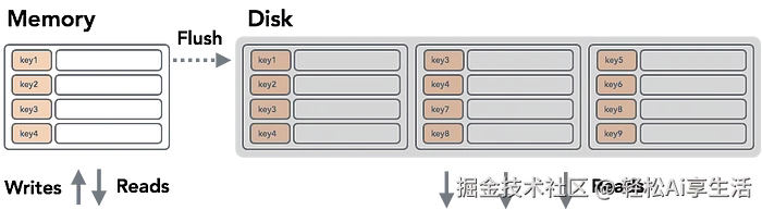 在 LSM 树中,所有写入都是针对可变的内存数据结构执行的(同样,通常使用允许对数时间查找的数据结构来实现,例如 B-Tree 或SkipList)。每当树的大小达到某个阈值时(或者在某个预定义的时间段过去之后,以先到者为准),我们将数据写入磁盘,创建一个新的 SSTable。此过程有时称为“刷新”。检索数据可能需要搜索磁盘上的所有 SSTable,检查内存表并将它们的内容合并在一起,然后返回结果。