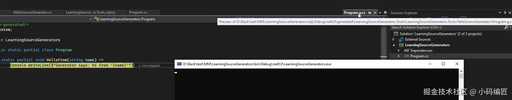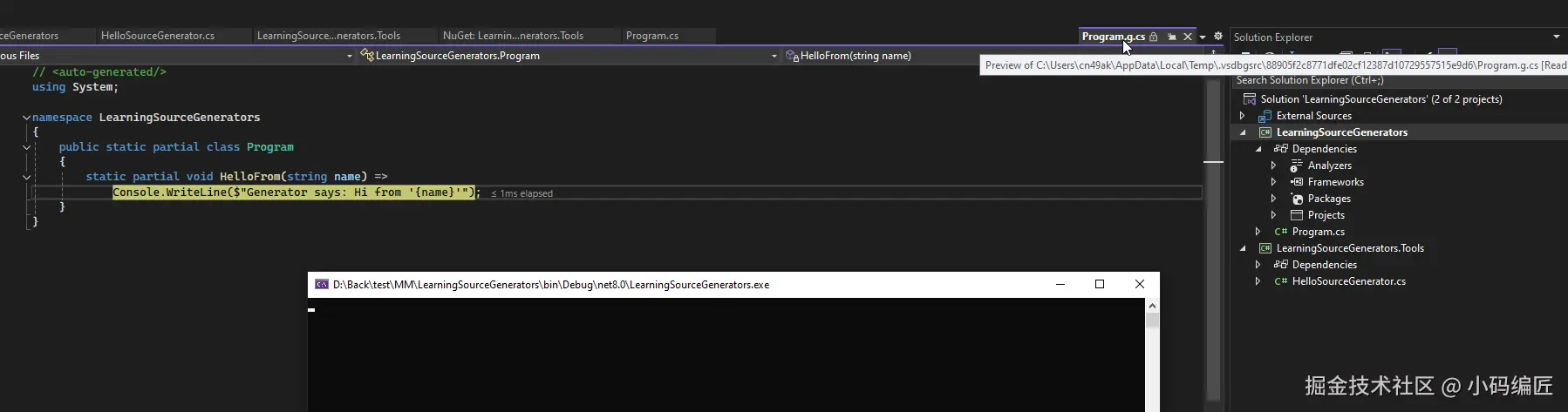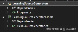 然后我们添加LearningSourceGenerators.Tools项目到我们的LearningSourceGenerators控制台项目中。