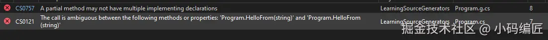 解决方法就是去掉对 CompilerGeneratedFilesOutputPath 的文件的引用,确保只有引用源代码生成器在内存的一份代码,如以下代码: