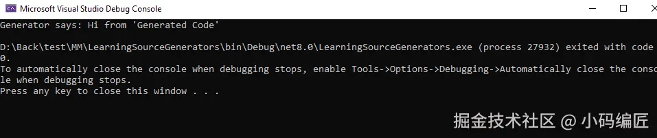 此示例中的 source 是一个内插字符串,它对要生成的源代码进行模板化,其中内插的缺口填充了包含的命名空间和类型信息。 使用提示名称将 source 添加到 context。 对于此示例,生成器创建一个新的生成的源文件,其中包含控制台应用程序中 partial 方法的实现。 可以编写源生成器来添加任何喜欢的源。