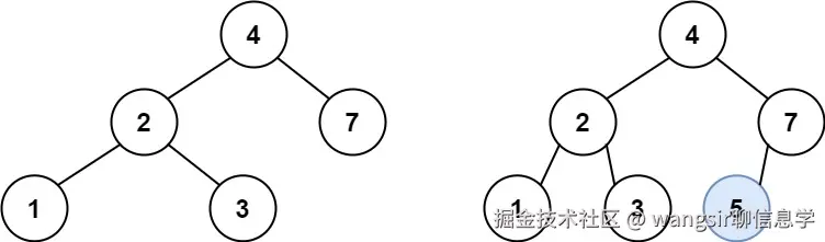 输入:root = [4,2,7,1,3], val = 5 输出:[4,2,7,1,3,5] 解释:另一个满足题目要求可以通过的树是:示例 2: