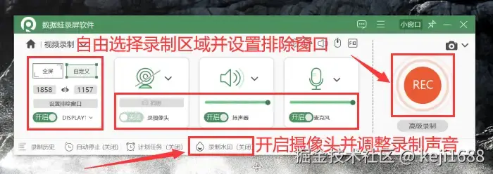 步骤2:录制开始前,我们可以自由选择录制的区域和设置好排除窗口,调整好摄像头和声音后点击【REC】录制按钮进行录制。