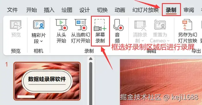 PPT除了能制作演示文稿,其本身也有自带的录屏功能,适合录制教学视频。使用方法是:打开需要录制的PPT文稿后,点击右上方的【录制】,选择【屏幕录制】。自由框选好录制区域后进行录制。
