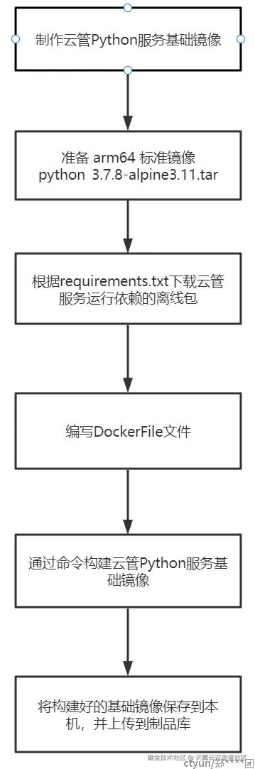 我是通过下载离线依赖包这种方式,之后我将上述步骤整理编写成DockerFile文件,通过docker命令直接构建云管Python应用的基础镜像,将编译好的基础镜像上传到制品库。