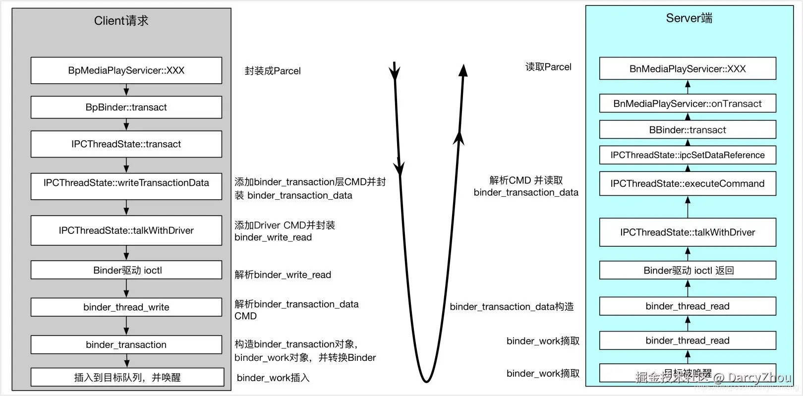 (4)通过IPCThreadThread的talkWithDriver()与Binder驱动通信,传递语义BINDER_WRITE_READ;