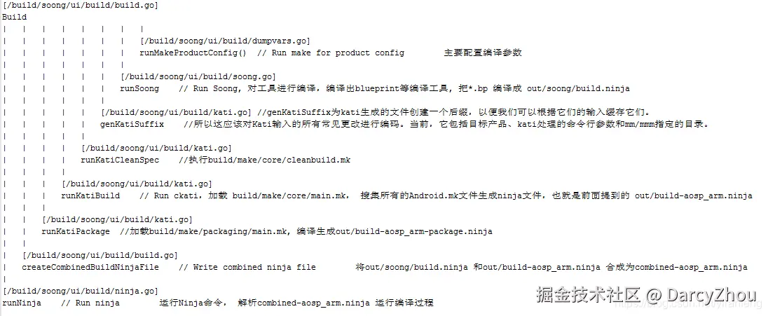 根据上述的相关参数可知,最终是调用系统准备好的prebuilts/build-tools/linux-x86/bin/ckati参与编译,其中传入的参数有--ninja\ --regen--detect_android_echo等,最终编译出build-aosp_arm.ninja。具体的kati实现过程比较复杂,这里就不详细展开,有兴趣的朋友,可以把/build/kati中的C++源码详细的分析一下。