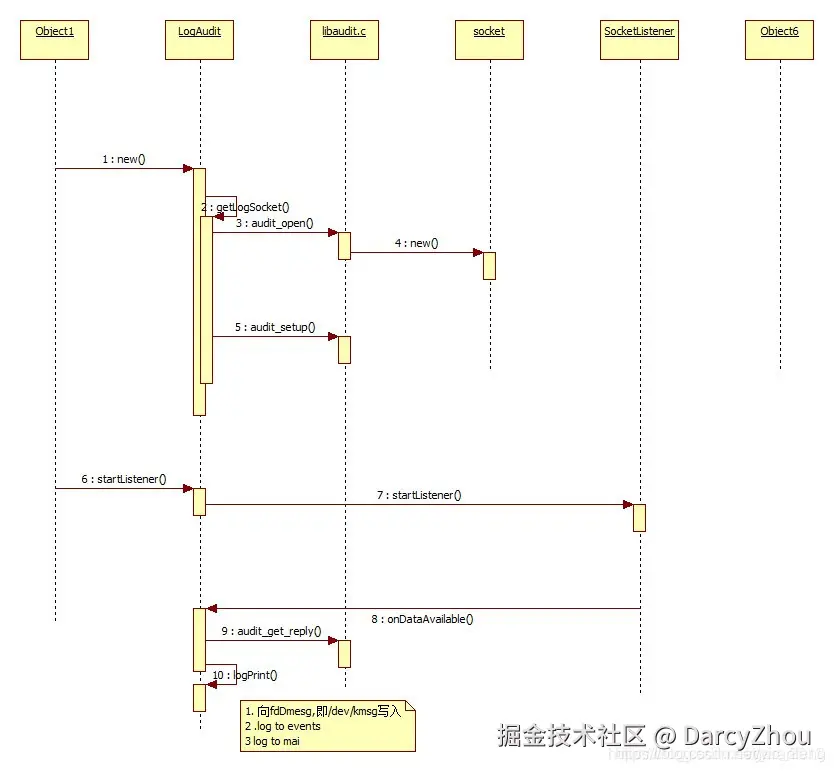 启动socket监听后,调用onDataAvailable(),与logd.auditd建立连接,调用recvfrom()接收socket传来的数据,最终调用logPrint把/dev/kmsg 内容写入“log to events”"log to main",并通知LogReader有日志写入。